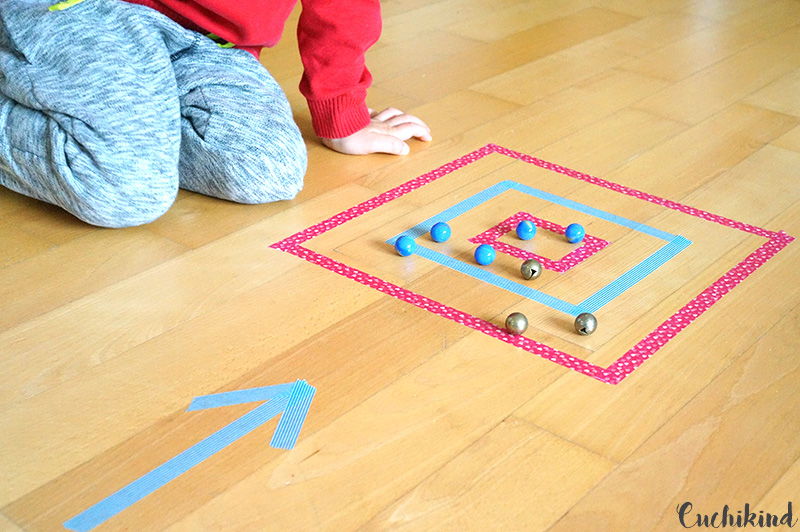Ok, das kam jetzt leider nicht ganz so gut bei Finn an, aber vielleicht bei euren Kindern. Das Spiel an sich kann jeder so gestalten, wie er das möchte. Bei uns gab es 3 Punkte, wenn die Murmel in der Mitte liegen geblieben ist, 2 Punkte im 2. Rechteck und einen Punkt im äußersten. Unser Boden war leider so glatt, dass die Kugeln immer über die Markierungen gerollt sind.