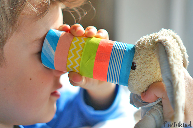 Das ist wirklich so einfach gemacht. Umwickelt eine Klopapierrolle mit verschieden farbigen Tapes und fertig ist das Fernrohr. Wie ihr seht durfte Finns Lieblingshase, der Bunni, auch mal durchschauen.