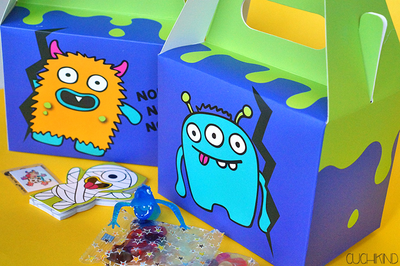 Und das sind die tollen Giveawayboxen. Sie lassen sich einfach zusammenbasteln und sind sehr stabil. Gefüllt habe ich sie mit zwei Gummibärchentüten, einem Monstertattoo, einem Monsterblock und einem Fingermonster. Und die gebastelten Lesezeichen und Becher durften auch mit rein. Gott sei dank hatte ich noch eine mehr, denn Finns Lieblingskuscheltier wollte am Ende auch eine haben.