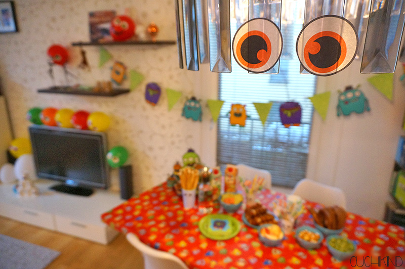 Hier seht ihr in etwa unsere Deko. An der Wand eine Monstergirlande, Luftballons mit Augen, Monstergeschenkpapier um den Tisch und einfach alles hat Wackelaugen bekommen. Als ich im Netz nach Monsterpapptellern gesucht habe, bin ich auf die Seite tambini.de gestoßen. Sie hatten mit Abstand die schönsten Sachen und preislich auch voll in Ordnung. Ich habe ein paar Sachen zugeschickt bekommen und war so begeistert, dass ich gleich noch eine Bestellung aufgegeben habe.