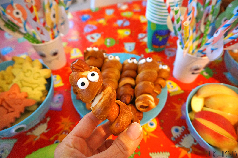 Zu Essen gab es einmal die Monsterkekse (Rezept hier), dann Monstermuffins in groß und klein mit Deko und Monsteraugen, Trauben mit Schokogesichtern, Grissini mit Augen (essbar), Apfelscheiben, Brezel und Würstchen mit Brezelteig und Augen. Die Würstchenidee habe ich bei Pinterest gesehen. Hier kommt ihr auch zu meiner Pinnwand „Monsterparty“. Wir hatten am Ende noch einiges übrig. Die kleinen Muffins waren zuerst weg, das Obst wurde seltsamerweise wenig angerührt. Kann ich gar nicht verstehen. 😉