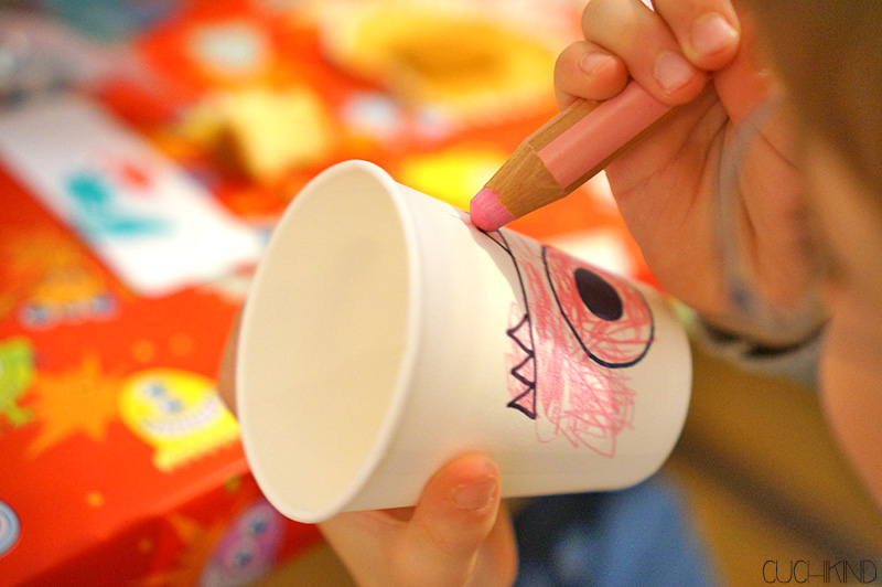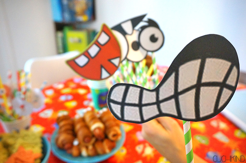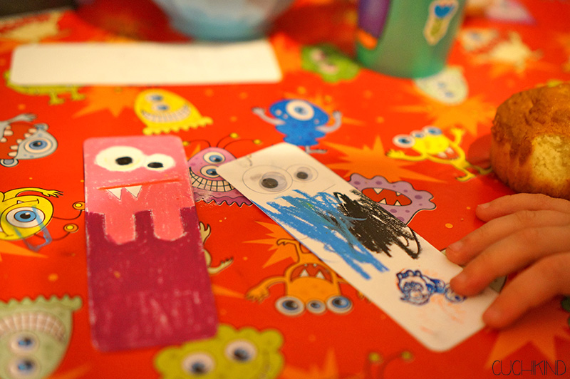 Und jetzt kommen wir zur Bespaßung. Leider ist es mit Vierjährigen nicht ganz so einfach. Spiele wie Luftballontanz und Reise nach Jerusalem wurden irgendwie nicht richtig verstanden. Ein paar Gesellschaftsspiele haben wir aber mitgemacht. Für Fotos habe ich Monsteraugen und -münder ausgeschnitten und an Papierstrohhalme geklebt. Die Kinder hatten großen Spaß daran.