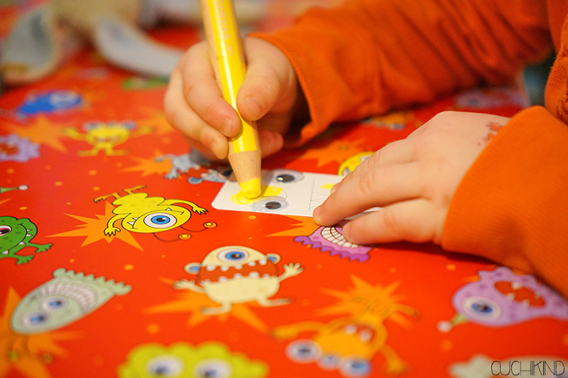 Und wir haben ein bisschen gemalt und gebastelt. Monsterbecher durften bunt bemalt werden. Und wir haben Lesezeichen ausgedruckt, die wir auch angemalt und mit Wackelaugen versehen haben. Das hat den Kids Freude bereitet und es war mal ein bisschen ruhiger.