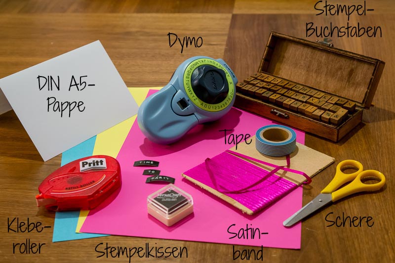 Für die erste Einladungskarte braucht ihr folgende Materialien (Stempelbuchstaben über Dawanda, Dymo-Juniorgerät hier (Amazon Partnerlink)):