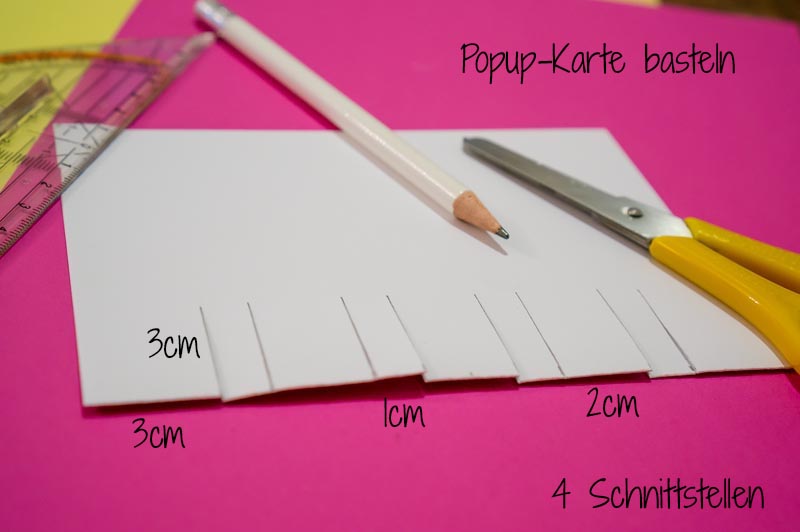 Die weiße DIN A5-Pappe habe ich eingeschnitten, wie ihr es auf dem nächsten Foto sehen könnt. Die Ziffern für das Datum habe ich 1,5cm im Fuß und oben höchstens 2,5cm breit ausgeschnitten und mit dem Kleberoller auf die ausgeklappten Streifen geklebt. Auf zwei gelbe Pappstreifen habe ich das „Wo?“ und „Wann?“ aufgestempelt und diese aufgeklebt. Die Muffins habe ich per Hand gemalt, ausgeschnitten und auf gelbe Pappe geklebt und anschließend die kleine Wimpelkette mit Satinband und Tape gebastelt.