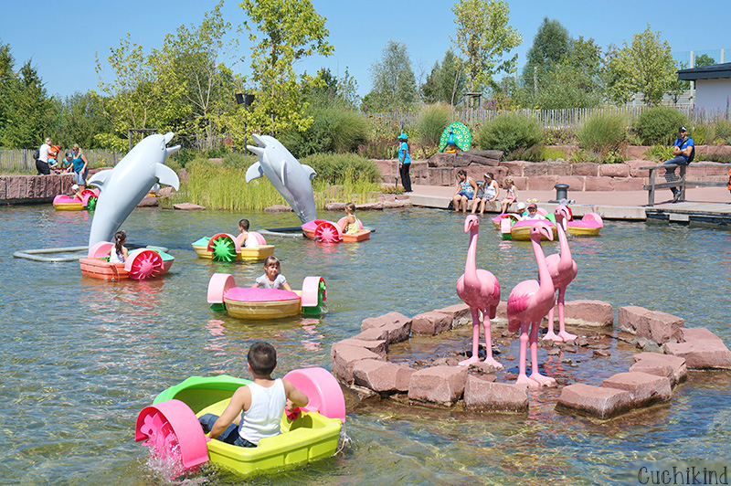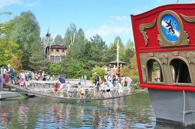 Das nächste Highlight, das Piratenschiff. Um das Schiff sind mehrere Floße, die man entweder per Paddel oder mit dem Seil bewegen kann. Direkt daneben steht das Baumhaus, eines der ältesten Attraktionen. Neben mehreren Hängebrücken gibt es unterirdische Gänge und einen kleinen Fluss.