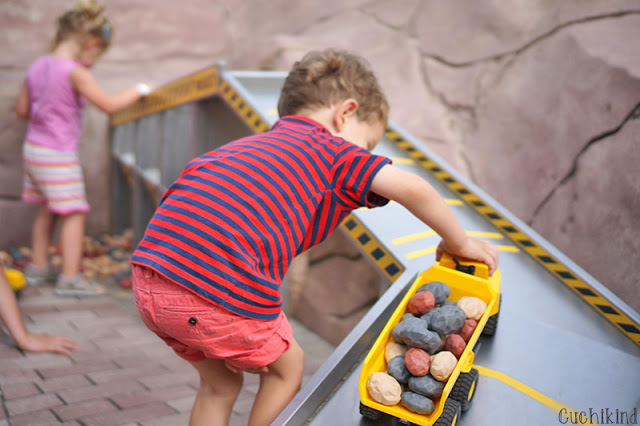 Finn war schon zu Beginn kaum zu halten. Der Steinbruch bietet Bagger und Laster für alle Kinder und wir hätten wohl alleine hier 3 Stunden verbringen können. Die Steine wurden aufgeladen, in Rohre gekippt und zur nächsten Baustelle gefahren.