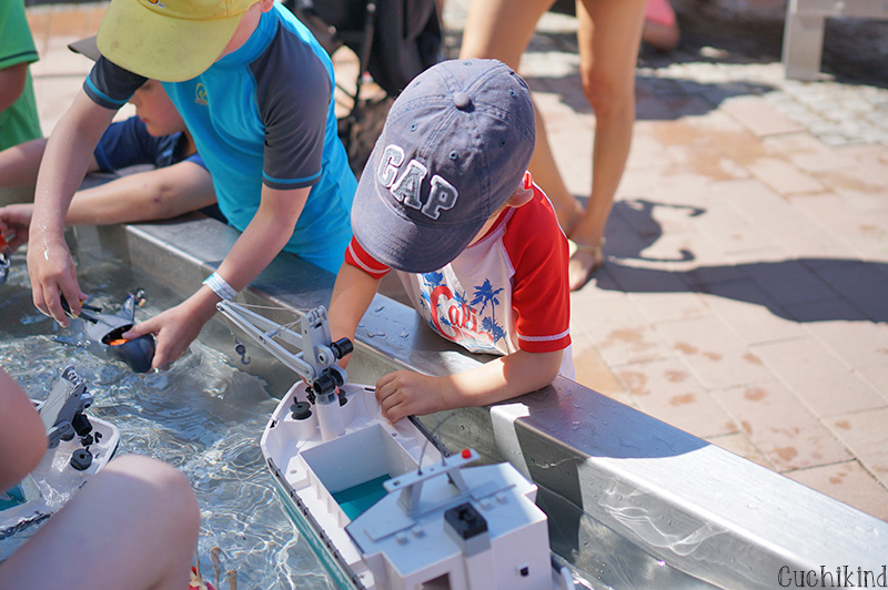 Die kleinen Boote und die Autos der Polizeistation konnten wir noch nicht nutzen, dafür war er zu klein, aber dafür haben wir den riesengroßen Matschspielplatz mit Fluss besucht. Ein Paradies bei den momentanen Temperaturen.