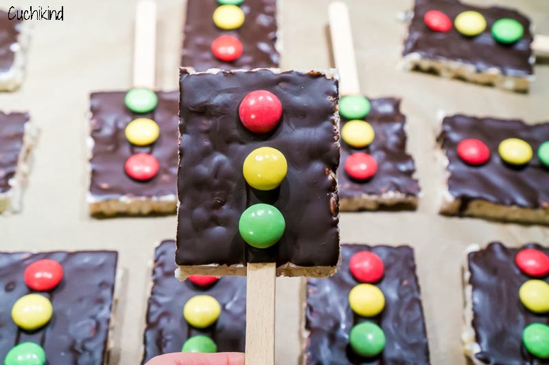 Die Reisampeln funktionieren genau wie die Smileys, nur dass man die runden Waffeln vorher noch rechteckig schneidet.