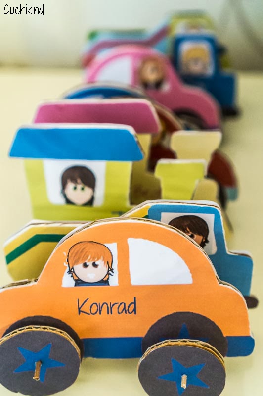 Ich wollte für Finn eine Auto-Deko machen, da es eigentlich nichts gibt, über das er sich mehr gefreut hätte. Also habe ich mir wieder die Weemee-App geschnappt und alle Kinder entworfen und diese dann im Photoshop in Fahrzeuge gesetzt. Natürlich musste ich auch Sterne einbauen 😉 Die Kinder durften ihre Autos natürlich auch mit nach Hause nehmen.