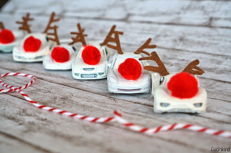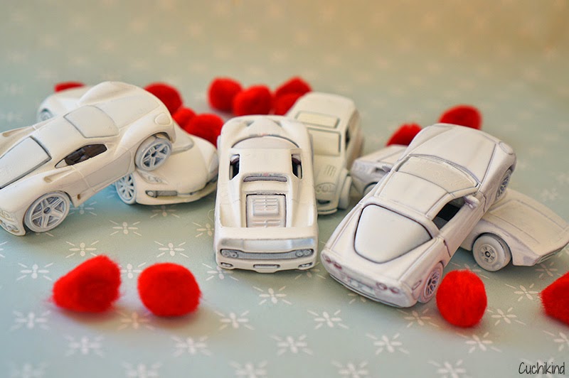 So sehen die Autos dann nach mehreren Schichten aus. Man muss die Farbe wirklich gut trocknen lassen, am besten ĂŒber Nacht, sonst hĂ€lt der Kleber nicht gut. Die roten Minibommeln sind aus dem Bastelladen und wurden zu Nasen. Ich habe sie mit Sekundenkleber aufgeklebt.