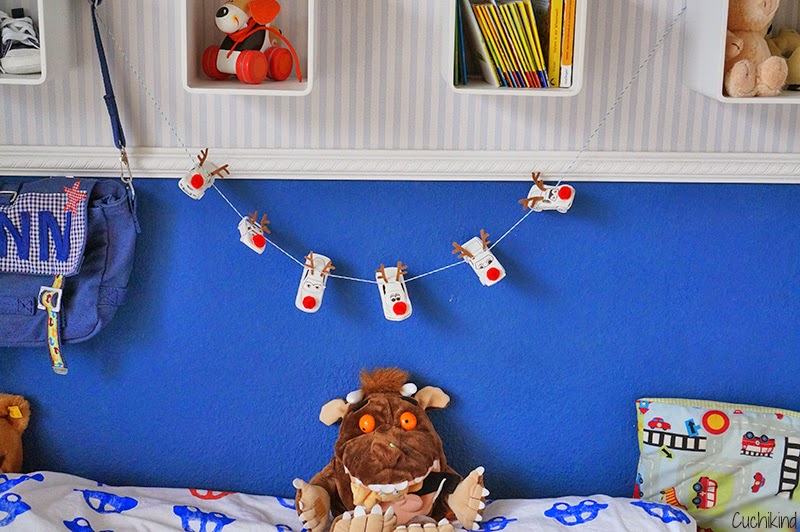 Die Auto-Girlande hĂ€ngt jetzt bei Finn ĂŒber dem Bett. Er passt sehr gut darauf auf. Nachdem die Nachbarskinder da waren, lag die Kette leider auf dem Boden und ein Kind hatte alle Nasen abgerissen, aber ich bin ja auch selbst Schuld, wenn ich sie nicht vorher wegrĂ€ume.