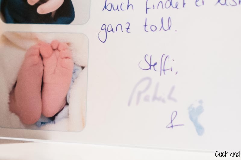 Das Besondere ist Finns „Unterschrift“ 😉 Wir haben seine kleinen Füße mit Fingermalfarbe beschmiert und Fußabdrücke gemacht, diese ausgeschnitten, eingescannt und verkleinert. Hier seht ihr das Ergebnis.
