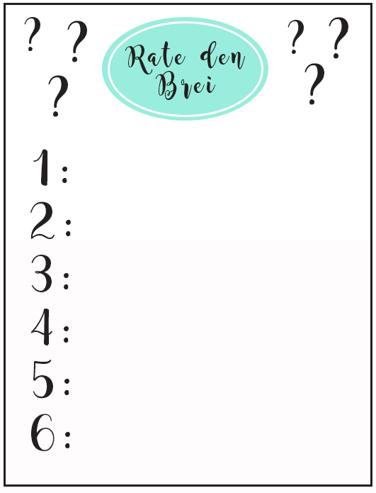 Ein sehr lustiges Spiel, das ich auch auf Pinterest gefunden habe. Ich habe sechs unterschiedliche Babybreigläschen gekauft und die Etiketten entfernt. Das geht übrigens sehr gut, wenn man sie in warmes Wasser stellt. Markiert vorher unbedingt, in welchem Glas was drin war. Dann habe ich meine eigenen nummerierten Etiketten (hier) aufgeklebt. Für die Mädels gab es die Antwortzettel (hier). Pro erratener Zutat gab es einen Punkt. Gewonnen hat, wer die meisten Punkte erreicht hat. Am besten kam übrigens das Rindfleisch an. Hust.