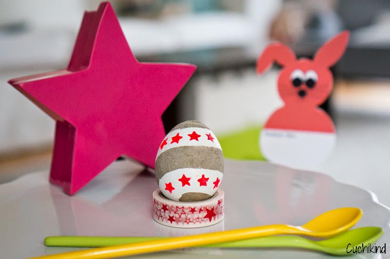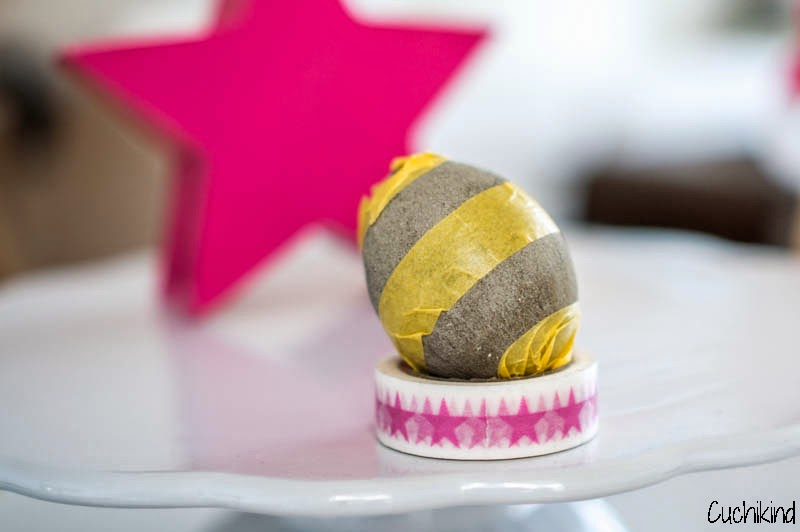 Natürlich konnte ich das Ei nicht einfach so lassen, sondern habe es noch mit Tape abgeklebt, weiße Streifen gemalt und kleine Sterne mit fluoreszierender Acrylfarbe aufgestempelt. Das Foto dazu findet ihr übrigens bei Instagram.