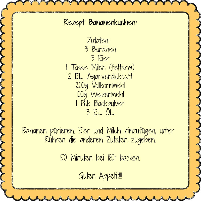 Die große Frage zum ersten Geburtstag war, welchen Kuchen ich Finn machen sollte, da ich ein Verfechter von keinem/wenig Zucker bin. Ich habe mich für Bananenkuchen entschieden und ein Rezept so umgewandelt, dass es keinen Zucker enthält. Die Kinder in der Kita und Finn fanden den Kuchen super und auch ich mag ihn. Man kann ihn allerdings nicht länger als einen Tag aufheben, dann schmeckt er trocken. Hier ist das Rezept: