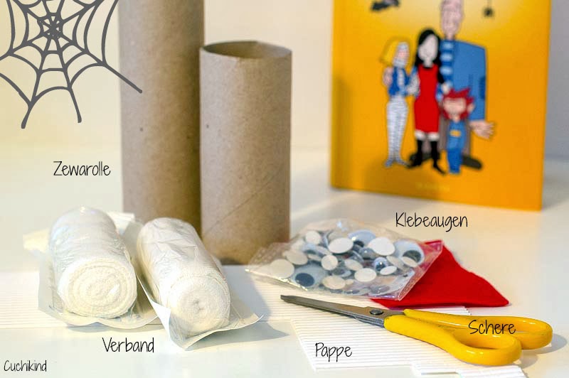1.) Ihr nehmt eine Zewarolle und schneidet sie nicht in der Mitte durch, damit eine Mumie etwas größer wird als die andere. Natürlich kann man auch Klopapierrollen nehmen, dann gibt es Mumienzwillinge.