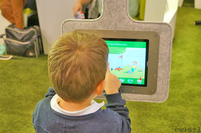 Tsja, so sehen die Buchmessen von heute halt aus. Ipads baumeln von der Decke und zeigen lustige Kinder-Apps. Komischerweise hatte Finn gar kein Interesse daran und ist gleich wieder zu den Büchern rüber. Da war ich beruhigt. Aber ich denke, in Zukunft wird es immer digitaler werden.