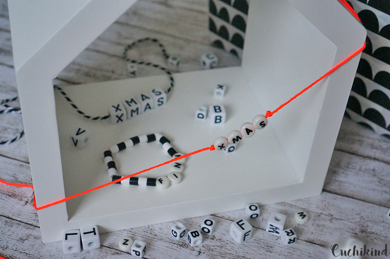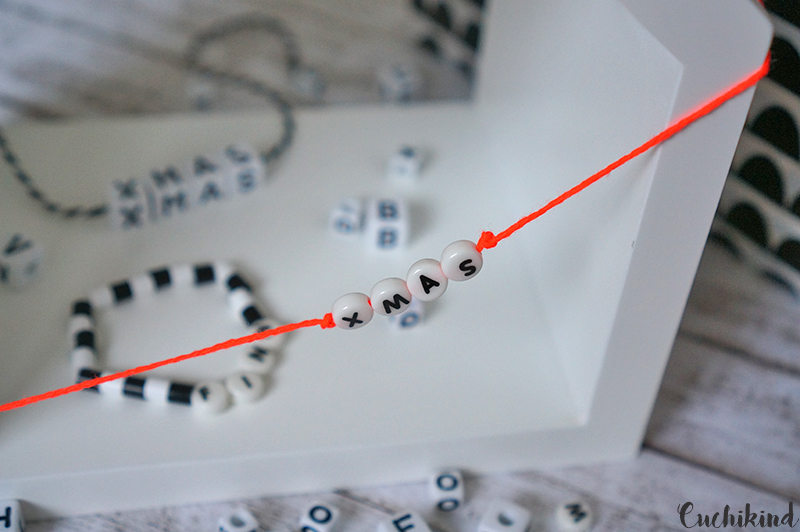 Auf neonfarbenes Garn habe ich die runden Buchstabenperlen aufgefädelt und an beiden Seiten einen Knoten gemacht, damit die Perlen nicht mehr verrutschen können. Man kann daraus entweder Armbändchen machen oder es auf Geschenke binden. Ich mag die Kombination aus Neon, schwarz und weiß.