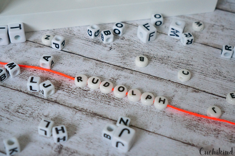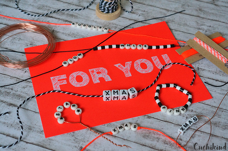 Aufgefädelt auf gestreiftes Bäckergarn sehen die Buchstaben besonders schön aus. Als Dekoration oder Verpackungsidee, alles ist möglich. Ganz oben seht ihr auch noch zwei Möglichkeiten mit Kupferdraht. Diese kann man sogar an den Weihnachtsbaum hängen.