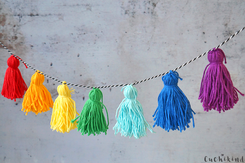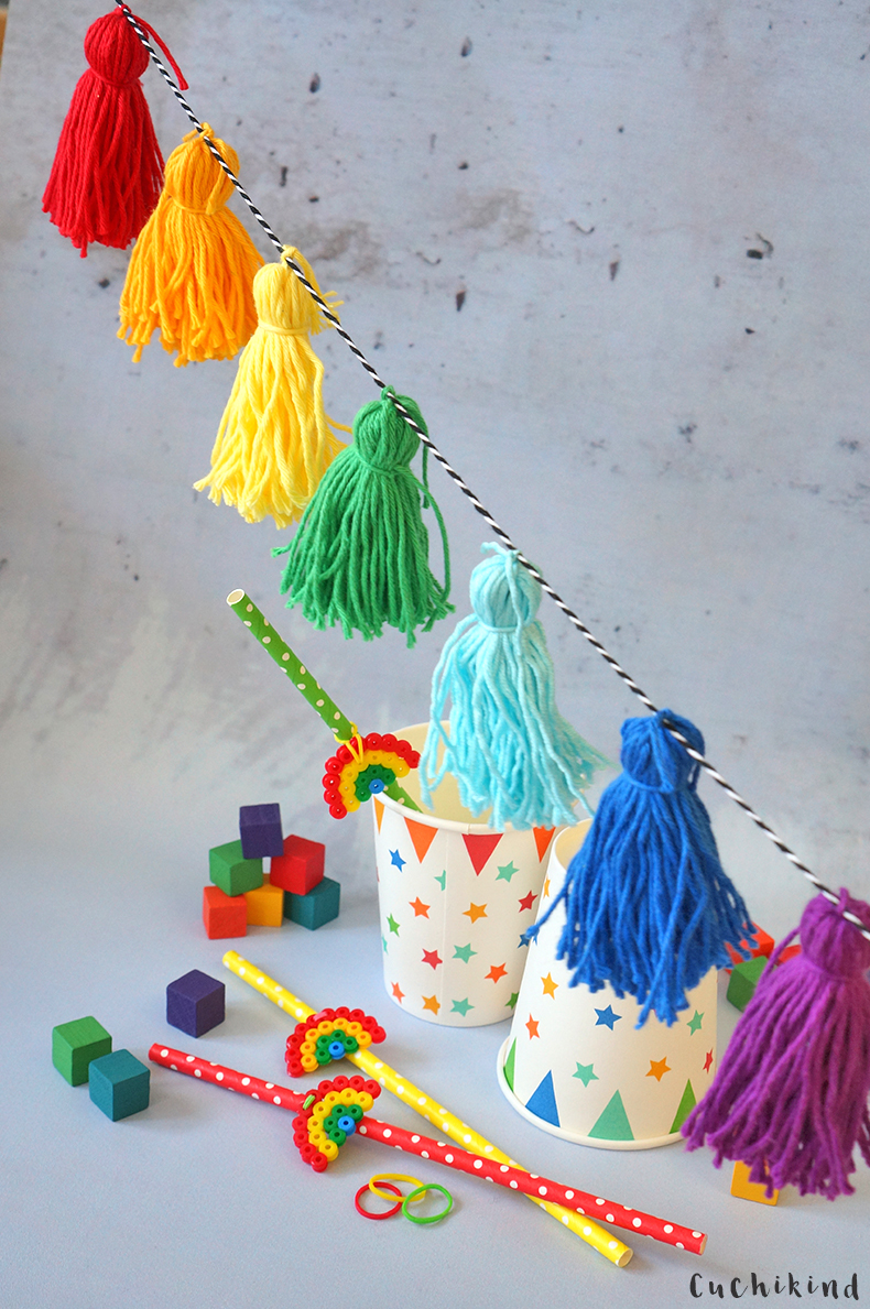 Heute habe ich mal wieder eine Partyidee für den nächsten Kindergeburtstag für dich. Deko für die Regenbogenparty oder den Einhorn-Geburtstag, passt für beides würde ich sagen. Nachdem ich dir schon unsere Monsterparty, den Polizeigeburtstag und die Weltraumfeier gezeigt habe, wird es heute richtig bunt. Wir haben tatsächlich gerade gar keinen Anlass zu feiern, aber die Ideen sind für eine nette Instafreundin, die ich heute Abend direkt bei Instagram verlinke. Die Girlande aus Quasten hängt jetzt bei uns am Kinderbett und macht sich da hervorragend. Auch ohne Kindergeburtstag! Und die Bügelperlenregenbogen werde ich als Schmuck für das nächste Geschenk benutzen.