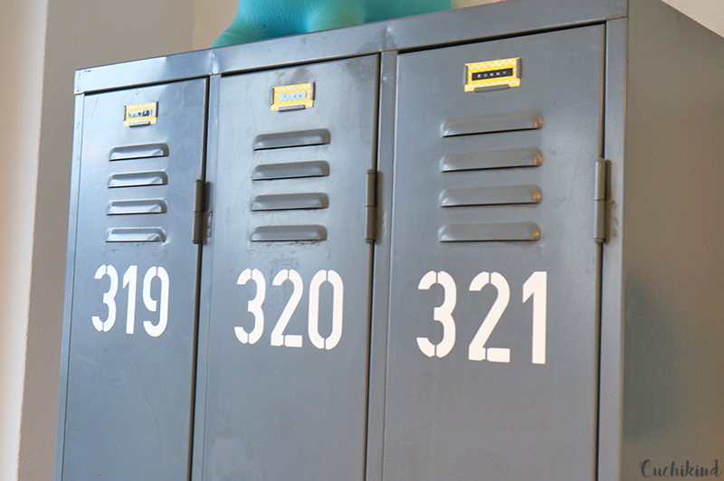 Auch Möbel können Dekorationsgegenstände sein, wenn man sie geschickt wählt. In Finns Zimmer steht ein Hüttenhochbett, ein Bücherregal (siehe unten) und dieser sehr alte Spind, den wir etwas gepimpt haben. Es ist nicht so einfach, einen alten, schönen, bezahlbaren Schrank zu finden. Ich bin bei Ebay-Kleinanzeigen fündig geworden und dann hatten wir noch das Glück, dass wir ihn kostenlos bekommen haben, weil ihn anscheinend keiner haben wollte. Wir haben ihn innen etwas vom Rost befreit und mit Klarlack angesprüht, damit die Kleidung nicht dreckig wird. Im Spind haben wir mehrere Kisten gestapelt mit Klamotten, die Finn noch nicht passen. Außerdem haben wir im Baumarkt eine neue Stange gekauft, zersägt und als Kleiderstangen genutzt. Außen habe ich Nummern geplottert und aufgeklebt sowie kleine Schildchen mit Namen gemacht.
