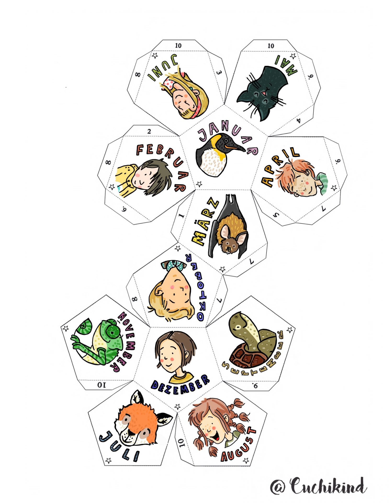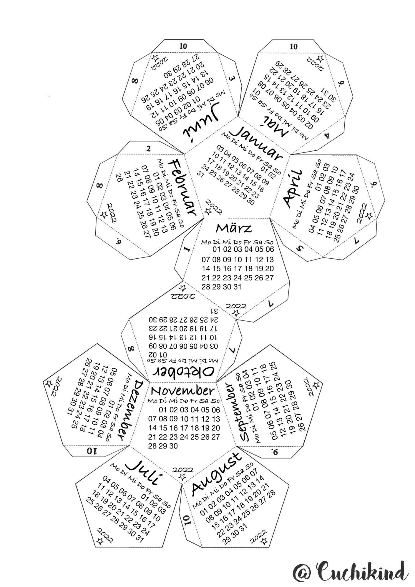 Jetzt schneidest du den Kalender einmal komplett außen herum aus (durchgezogene Linie) und knickst alle aneinander liegenden Kanten um (auch die Laschen).