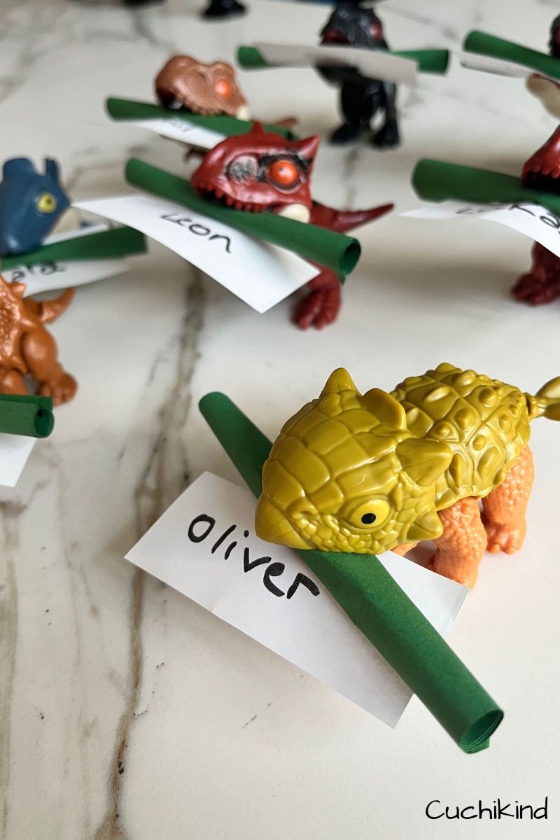 Statt klassischer Papierkarten habe ich diesmal etwas ganz Besonderes gebastelt: Kleine Dinosaurierfiguren dienten als Einladungen. Die Figuren hatten ein bewegliches Maul, das man aufklappen konnte. Genau dort habe ich eine zusammengerollte Einladung hineingeschoben.