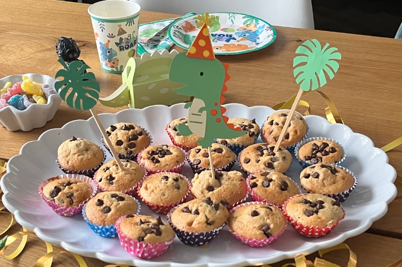 - Dino-Muffins: Schokoladenmuffins mit grüner Glasur und kleinen Dino-Streuseln.
