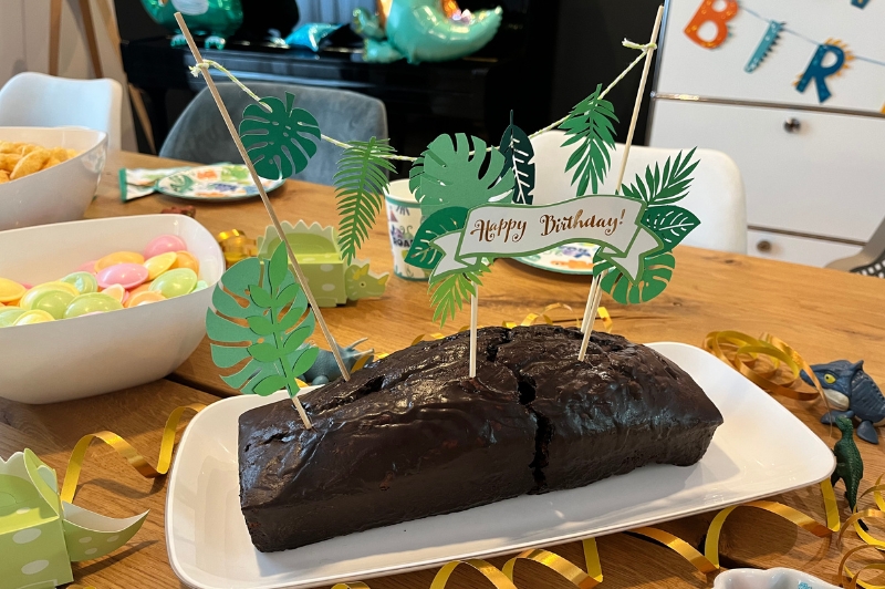 Natürlich durfte auch ein Geburtstagskuchen nicht fehlen – dieses Jahr habe ich mich für einen einfachen Schokokuchen mit Glasur entschieden und mit Dino-Deko besteckt.