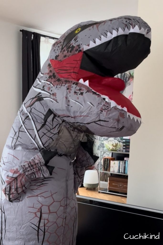 Das Highlight: Ein aufblasbares Dinosaurierkostüm