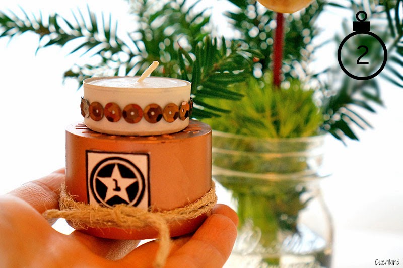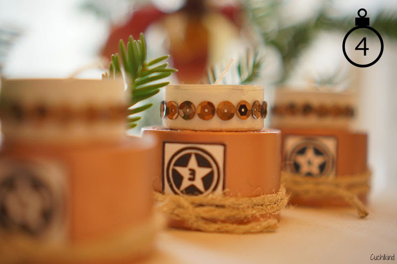 Ich habe normale Teelichter weiß angesprüht (also nicht die Kerze, ne 😉 ) und mit kupferfarbenen Pailletten beklebt. Außerdem habe ich Wasserflaschendeckel (das waren welche von so extravagantem Wasser, das genauso schmeckt wie Leitungswasser, aber so teuer ist wie ne Flasche des besten Rotweins) kupferfarben eingesprüht. Ihr könnt auch die Deckel der Sprühflaschen nehmen.