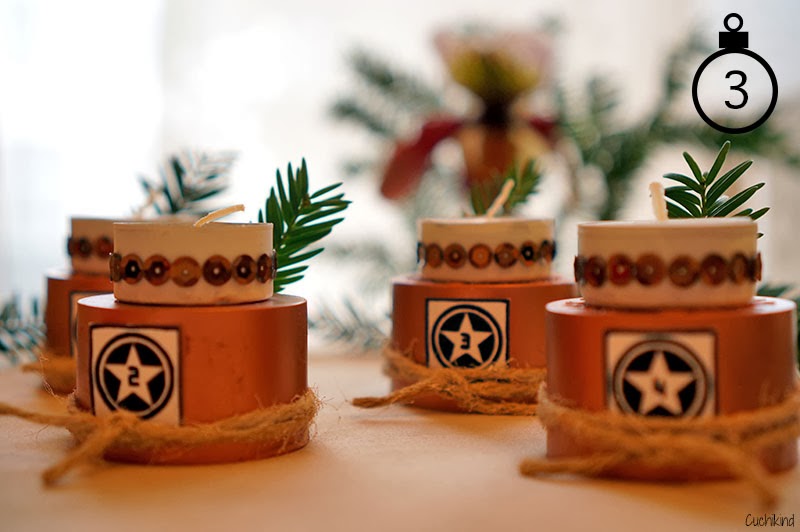 Dann habe ich Kordel weiß angesprüht (sieht man irgendwie gar nicht richtig), herum gewickelt und die kleinen Zahlenfelder ausgedruckt. Hier könnt ihr sie herunter laden. Um es weihnachtlicher zu machen, gab es noch Tannen-Indianerschmuck und als Unterlage Pappe mit rotem Sternchenstoff. Ich bin mir aber noch nicht sicher, ob ich diese nicht einfach weglasse.
