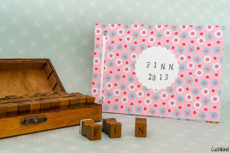 Wenn ihr einen Stanzer habt, könnt ihr eine bunte Pappe aufkleben und mit Buchstaben bestempeln. Natürlich könnt ihr dies auch mit der Schere ausschneiden und etwas darauf schreiben. Fertig ist das erste Fotobuch.