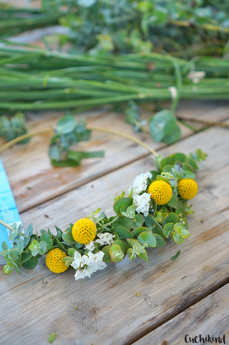 Das DIY hat mir am meisten Spaß gemacht und ist dabei so einfach und wunderschön anzusehen. Mit dem Hygge-Magazin und Bastelliebe Hamburg haben wir die Blumen einfach immer in eine Richtung an den Ring gebunden. Zuerst wird ein spezielles Klebeband um den Ring gewickelt, damit die Blumen besser halten. Dann schnürt man mit dem Blumendraht vorsichtig um die Pflanzen, immer in einer Richtung, damit sie nicht kaputt gehen. Das war es eigentlich schon. Der Ring hängt mittlerweile bei uns an der Wohnzimmerwand und ich muss immer lächeln, wenn ich ihn anschaue.