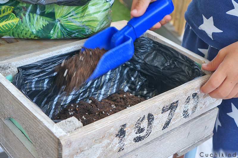 Finn hat mir netterweise geholfen und die Erde eingefüllt. Die zwei Blümchen hatte er sich selbst im Baumarkt ausgesucht, die blühen ganz bunt, wenn sie dann mal aufgehen.