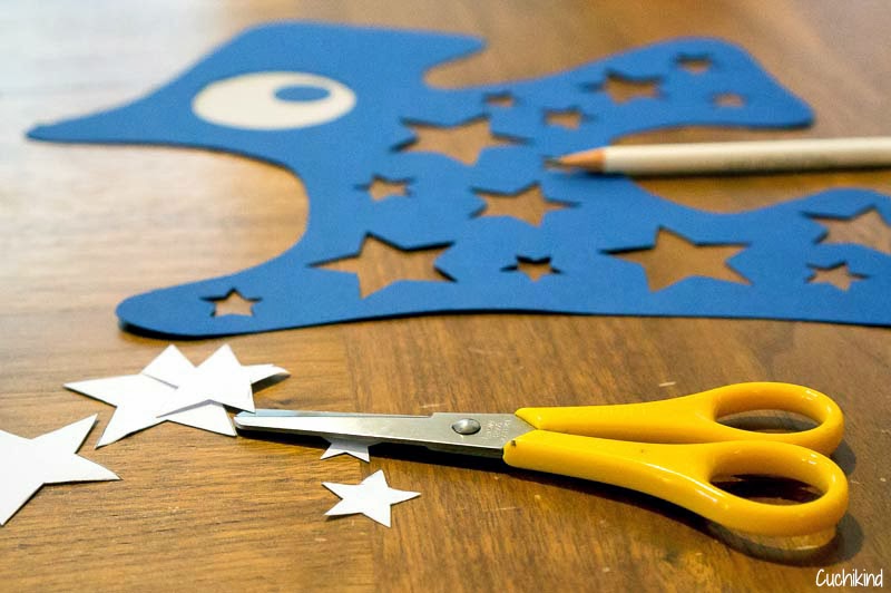 Wenn ihr die Vorlage ausgedruckt und auf die Pappe übertragen habt, könnt ihr diese zweimal ausschneiden (einmal seitenverkehrt). Danach habe ich die Löcher für die Augen mit einem Zirkel aufgetragen und ausgeschnitten. Außerdem habe ich lauter verschieden große Sterne in die Pappe geschnitten. Das geht am besten mit einer Nagelschere.