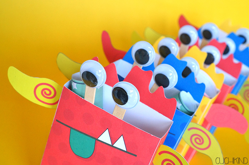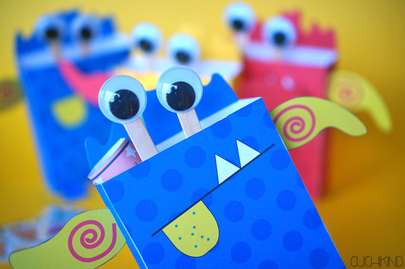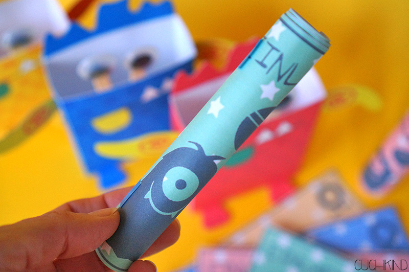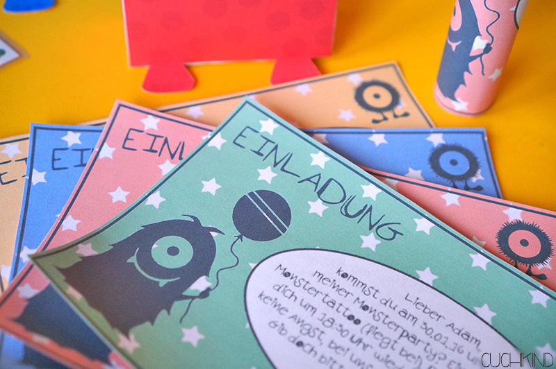 In die Monster habe ich die Einladungskarte gesteckt, die ich auf normalem Papier ausgedruckt und aufgerollt habe. Zugeklebt sind sie mit Washi Tape, da dies nicht die Einladung zerstört beim Aufmachen. Die Vorlagen gibt es unten für euch. Ihr müsst nur die Sprechblase füllen.