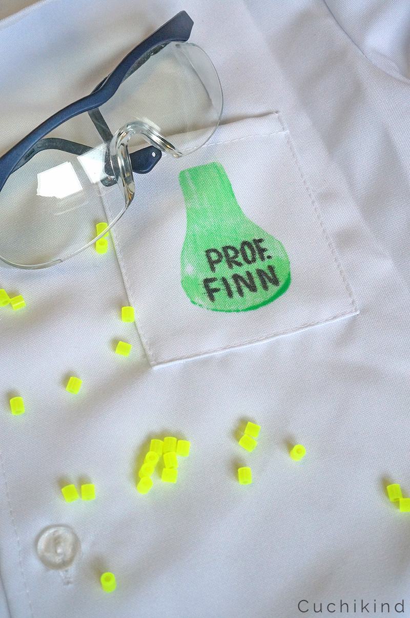 Bevor die Kinderparty richtig los ging, durfte jeder kleine Forscher seinen eigenen Kittel bestempeln und beschriften. Ich habe den Kolben vorher schon aus Moosgummi ausgeschnitten und auf einen Block geklebt. Mit Stofffarbe haben die Kinder die Form dann bepinselt und auf die Tasche gestempelt. Unbedingt eine Pappe unterlegen, damit die Farbe nicht durchdrückt.