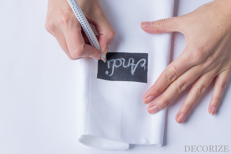 Wenn eure Farbe getrocknet ist, könnt ihr die Tafelfläche nach Belieben beschriften. Zum Beispiel die Servietten mit den Namen Eurer Gäste oder die Tischdecke mit Auszügen aus Weihnachtsliedern oder ähnlichem. Zum Beschriften nehmt ihr ganz normale weiße Schulkreide oder auch diese Kreidestifte, die aussehen wie weiße Bleistifte, wisst Ihr? Nur bitte keine flüssigen Kreidestifte nehmen, die funktionieren auf Textil nicht so gut unserer Erfahrung nach, da die weiße Farbe zu sehr aufgesogen wird vom Stoff.