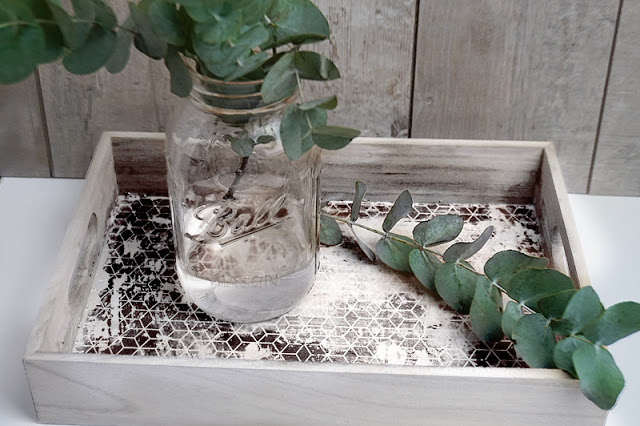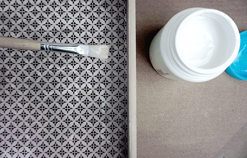 Für die Umsetzung der Fototransfer-Technik benötigt ihr ein helles Holzobjekt (in unserem Beispiel ein schlichtes Tablett), Geschenkpapier oder Servietten eurer Wahl, einen Pinsel, ein Transfer-Medium (wie Serviettenkleber oder Foto Patch) sowie eine Sprühflasche mit Wasser oder einen Schwamm.