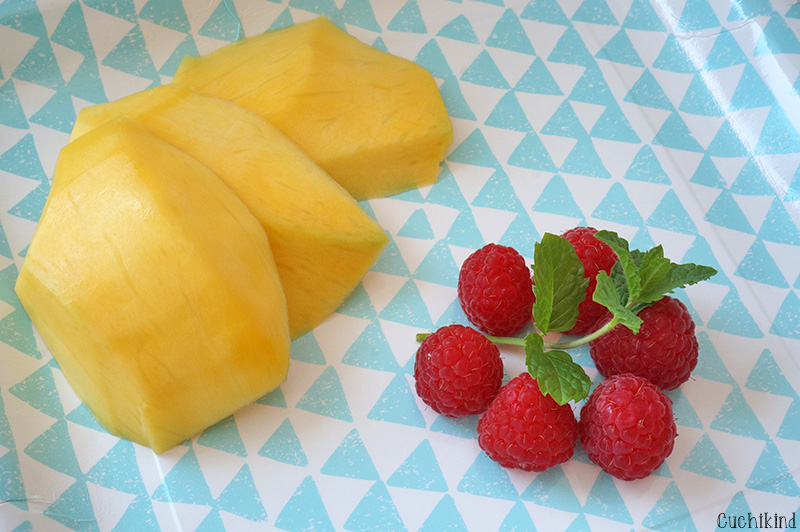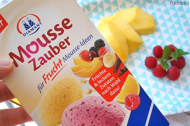 Moussezauber gibt es in verschiedenen Varianten, hier ist es „Frucht“. Man kann alles erdenklich Mögliche kombinieren. Ich habe mich für Mangostücke, Himbeeren und frische Minze entschieden. Das ganze wird mit dem Pulver aus der Packung verquirlt, kühl gestellt und fertig ist das Dessert. Es hat genau die richtige Konsistenz und schmeckt so lecker.