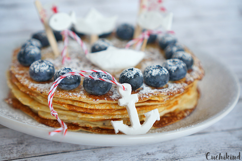 Also wer sich über so eine tolle Pfannenkuchentorte nicht freut, dem kann ich auch nicht helfen. Prinzipiell ist sie recht einfach gemacht. Natürlich müsst ihr erstmal einen Pfannenkuchen Teig herstellen oder kaufen und damit einen Stapel Crêpes machen. Diese legt ihr dann mit jeweils einer Schicht Puderzucker aufeinander. Also Deko habe ich Blaubeeren zu einem Kreis gelegt und nochmal alles mit Zucker bestreut.