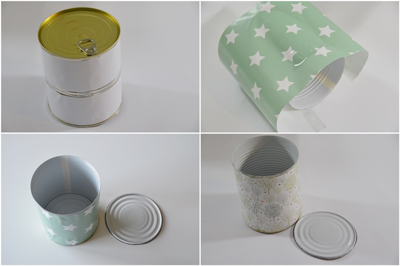 Das Papier mit Hilfe von doppelseitigen vorsichtig um die Dose kleben und fest andrücken. Eventuelle Überstände mit dem Cutter abschneiden.