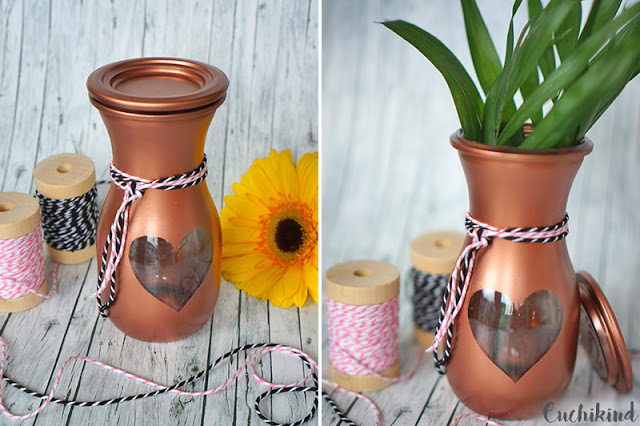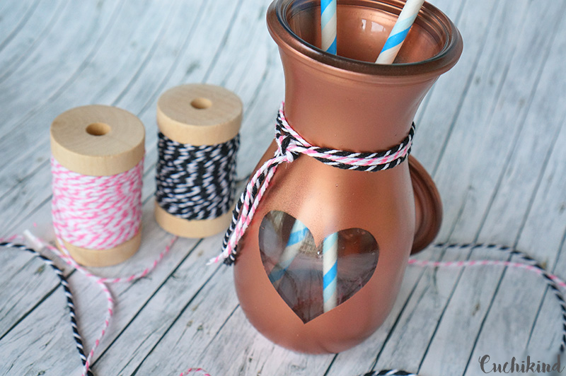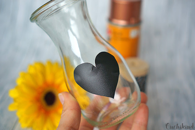 Ich habe also ein Herz aus Klebefolie ausgeschnitten und mittig auf das Glas geklebt. Anschließend habe ich mit Kupferspray von Marabu (aus dem Bastelladen) alles eingesprüht. Legt unbedingt eine Plane oder so drunter und macht das draußen. Die Farbe verteilt sich sonst im ganzen Raum und es riecht nicht so angenehm. Nach dem Trocknen habe ich das Herz vorsichtig abgezogen. Unreinheiten könnt ihr mit einer Schere noch abkratzen.