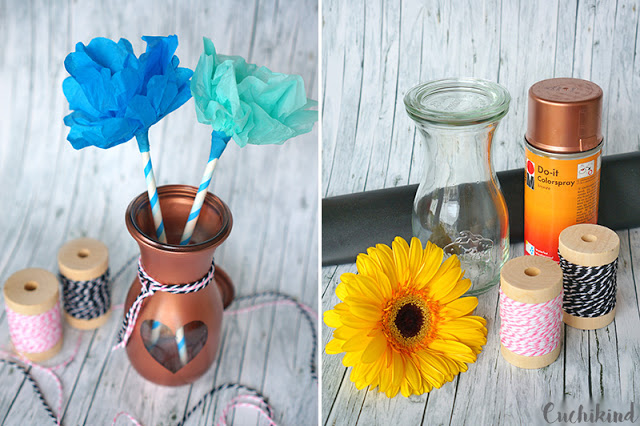 Damit es nicht so leer aussieht, habe ich noch Bäckergarn von Hema daran gebunden. Ihr könnt das Ganze entweder mit Süßigkeiten füllen und mit Deckel verschenken oder ihr steckt gleich ein paar Blumen hinein. Hier gibt es eine Anleitung für Seidenblumen, die halten sich wenigstens eine Weile.