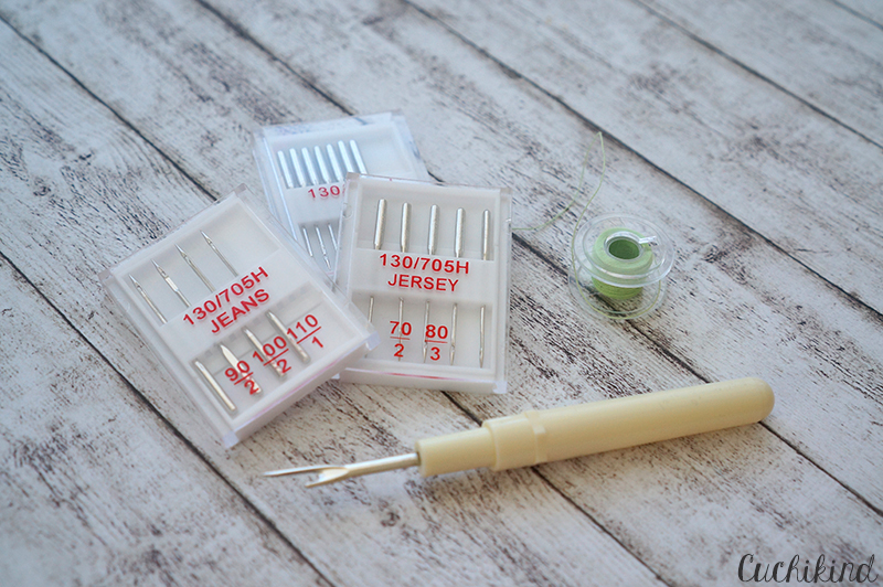 Ihr solltet Nähnadeln in verschiedenen Stärken zu Hause haben. Jeansstoff oder Leder benötigt zum Beispiel eine Stärke von 90-110, Jersey nur 70-80. Wenn ihr da nicht die passende nehmt, brechen sie euch einfach ab. Die Erfahrung mache ich selbst oft genug. Deshalb sollte man auch immer viele griffbereit haben.