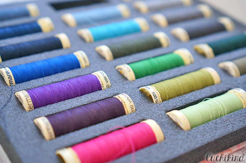 Man sollte einen Grundstock an Garn zu Hause haben. Ich habe mir ein Set von Gutermann (Partnerlink*) gegönnt. Das ist eine einmalige Investition und wenn ein Garn leer ist, kann man es einfach im Nähladen nachkaufen. Die Garnrollen sind in einer Art Buch verstaut, das sich mit einem Magnet verschließen lässt. Weiß und Schwarz habe ich immer in dicken Rollen da, die nutze ich am meisten. Ich mache es übrigens oft so, dass ich die bunte Farbe nur oben einfädele und unten die Spule bleibt weiß. Die sieht man meist eh nicht.