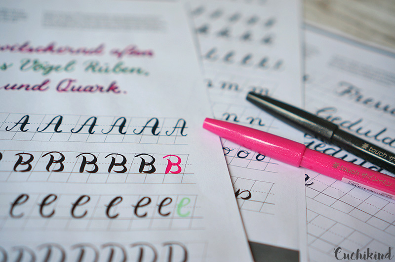Ausgestattet damit kann das wirklich jeder lernen. Ich habe die Seiten des Übungsbuches kopiert, damit mein Mann und ich gleichzeitig üben konnten. Er kann es definitiv besser als ich, damit muss ich klar kommen. Die richtigen Stifte sind allerdings auch wichtig, damit man den Unterschied zwischen den dünnen und dicken Linien gut hinbekommt. Ich habe mir bei Boesner einige Tombows* gekauft. Diese haben auf der einen Seite eine Art Pinsel und auf der anderen einen normalen Filzstift. Außerdem habe ich zwei Pental Brush Pens* mitgenommen, weil meine Kollegin die haben wollte. Sie arbeiten mit dem gleichen Prinzip, nur feiner.