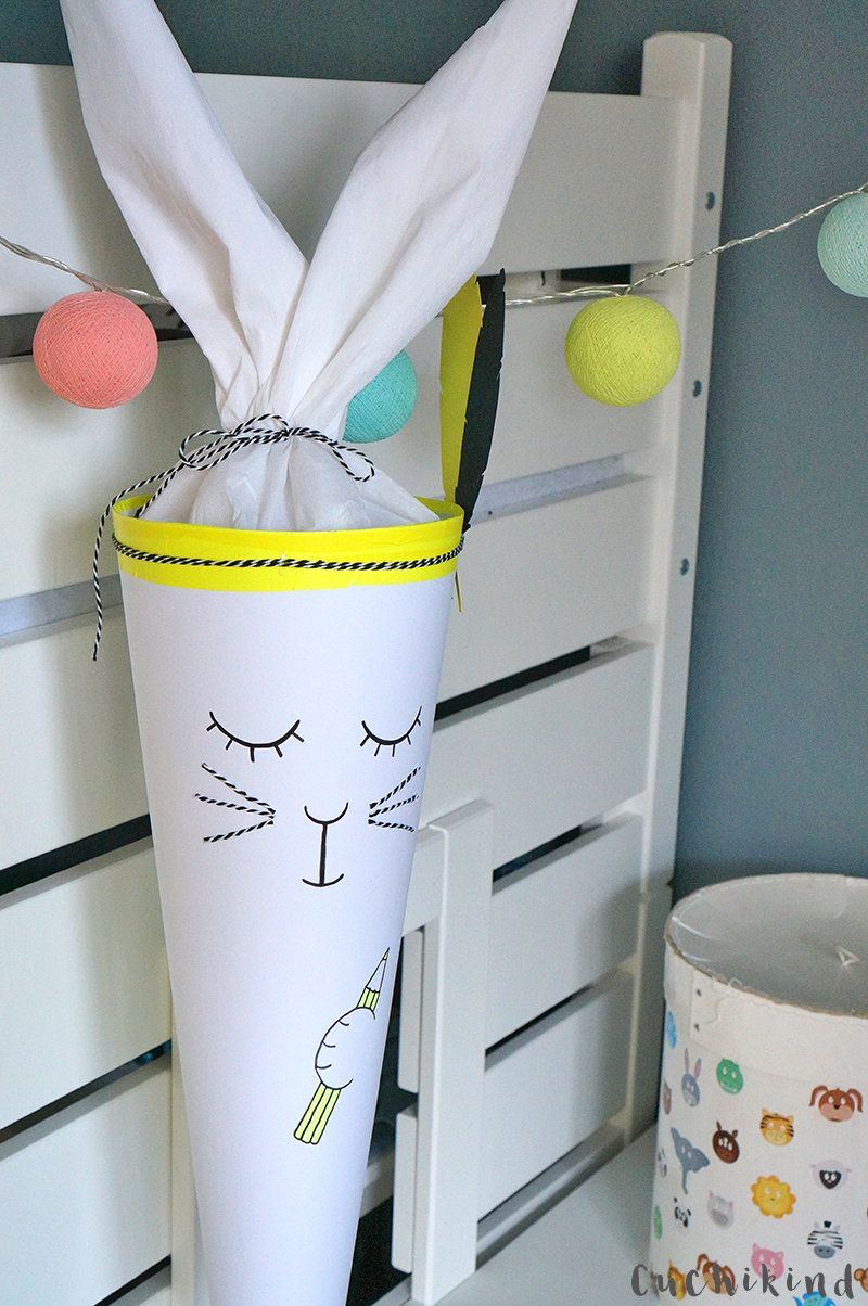 Ich kann gar nicht glauben, dass wir in drei Wochen ein Schulkind haben. Das ist so ein großer Schritt. Nicht nur für ihn, auch für uns. Ich bin so gespannt, wie das werden wird mit Hausaufgaben, neuen Kindern, viel mehr Verantwortung und richtigen Fächern. Einen Schulranzen mit selbstgemachten Kletties haben wir ja schon und die ganzen Materialien habe ich auch schon besorgt. Namensaufkleber sind bestellt und die Familie zur Einschulungsfeier eingeladen. Mein nächstes to do war dann also die Schultüte. Ich bin unheimlich froh, dass mein Sohn kein Fußball- oder Starwars-Fan ist und ich an diesen Mottotüten vorbei gekommen bin. Irgendwie war ja eh klar, dass ich was basteln werde. Da Finn schon immer Hasen liebt, wollte ich zuerst einen kleinen Bunny häkeln oder modellieren und vorne auf die Tüte kleben. Dann kam mir aber eine bessere Idee. Warum nicht aus der Schultüte einen kompletten Hasen machen.